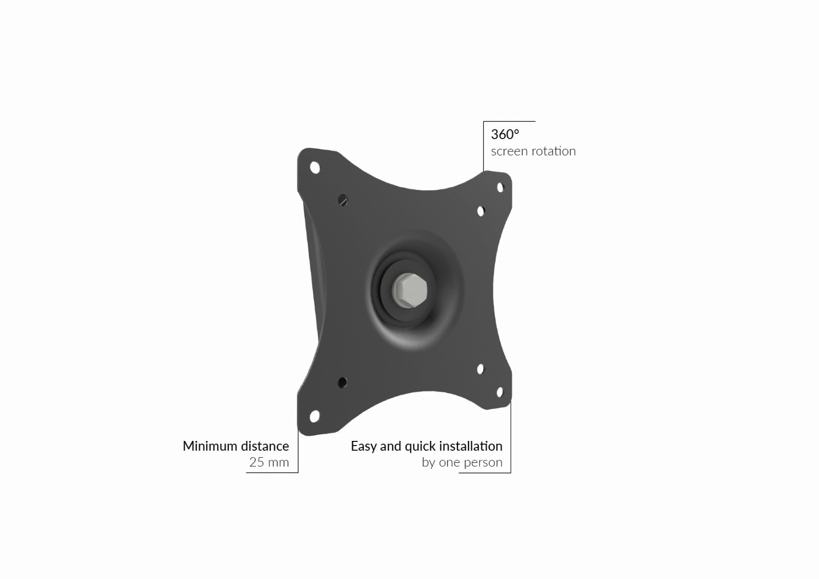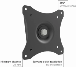 Praktische en compacte beugel voor monitors en kleine tv’s met een diagonaal van 10–29″ is ideaal waar u een ruimtebesparende oplossing met minimale afstand tot de muur nodig hebt. De constructie maakt 360° rotatie van het scherm mogelijk, zodat u eenvoudig wisselt tussen liggende en staande oriëntatie. De metalen body met slank profiel (slechts 25 mm van de muur) behoudt een strak interieur.
