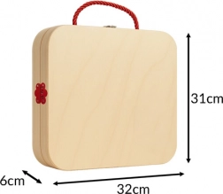 Duurzame koffer van multiplex met metalen sluiting en touwhandvat houdt alle onderdelen bij elkaar en maakt opbergen en meenemen eenvoudig.