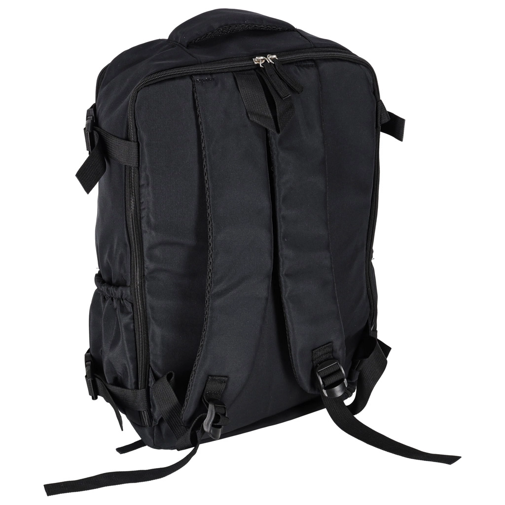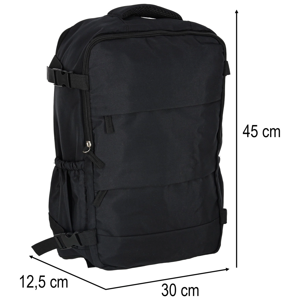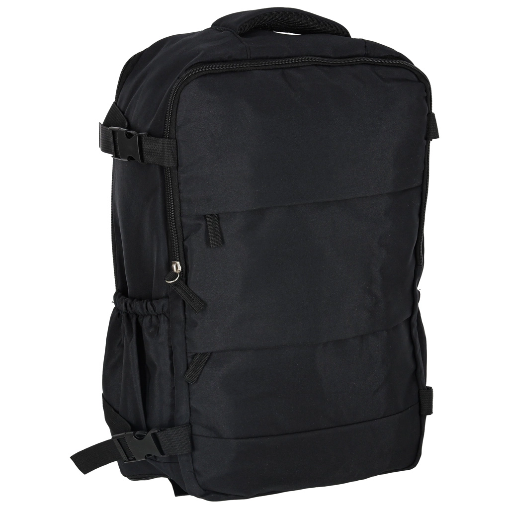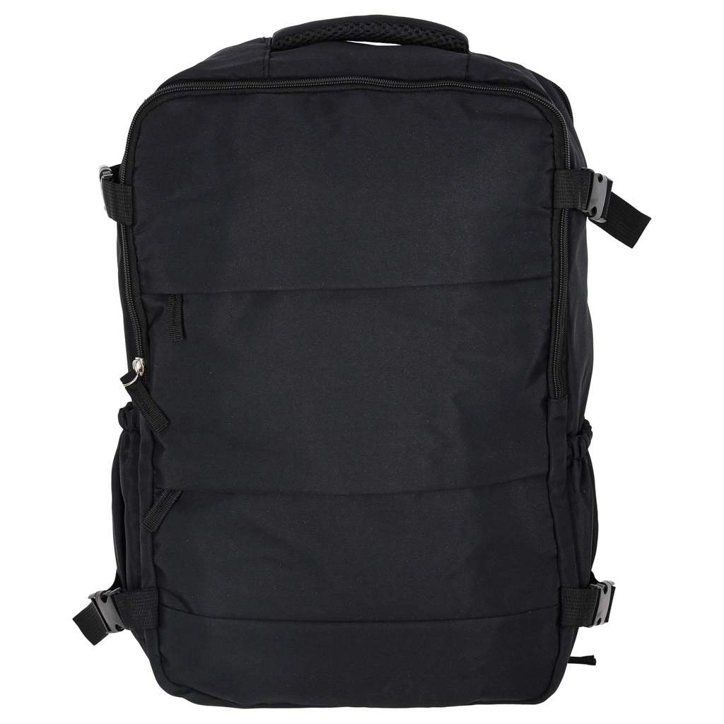 Zoek je een veelzijdige rugzak voor een weekend, zakenreis of als handbagage in het vliegtuig? Deze zwarte reisrugzak van stevig Oxford 420D-polyester biedt een doordachte indeling met drie compartimenten (twee bovenvakken met rits en één ondervak) en vier buitenvakken, inclusief zijvakken voor een fles met elastische rand.