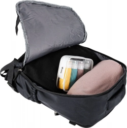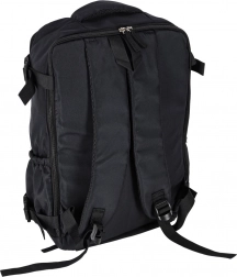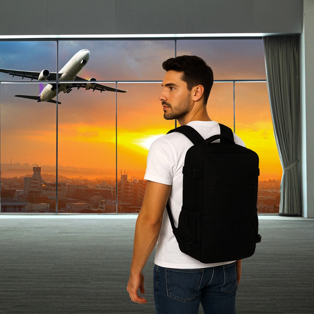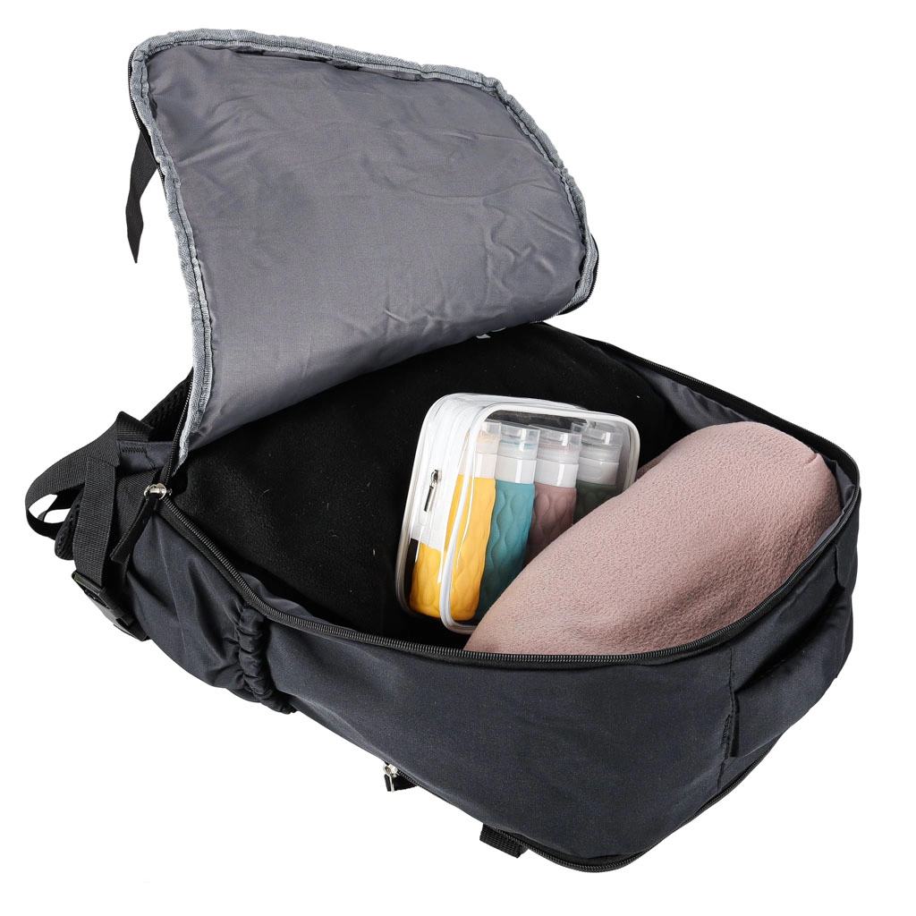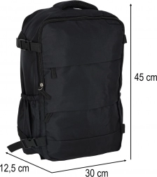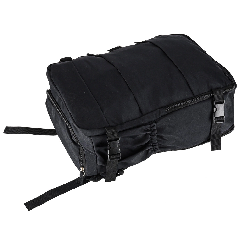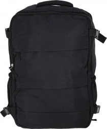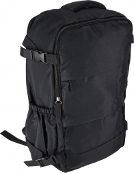 Zoek je een veelzijdige rugzak voor een weekend, zakenreis of als handbagage in het vliegtuig? Deze zwarte reisrugzak van stevig Oxford 420D-polyester biedt een doordachte indeling met drie compartimenten (twee bovenvakken met rits en één ondervak) en vier buitenvakken, inclusief zijvakken voor een fles met elastische rand.