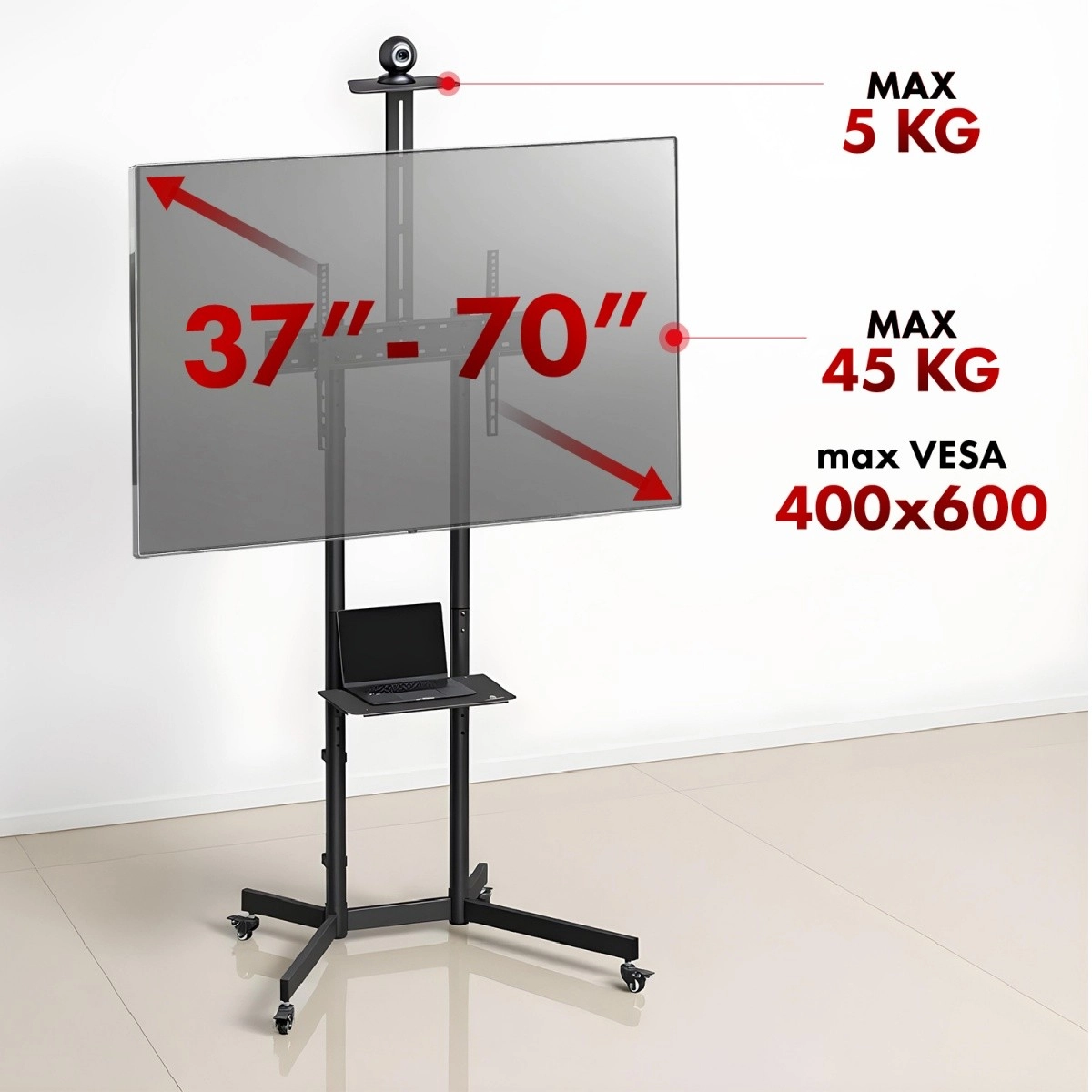 De mobiele tv-standaard is ideaal voor vergaderruimtes, klaslokalen en thuisgebruik. De stabiele stalen constructie zorgt voor een veilige bevestiging van de meeste moderne televisies tot 45 kg. Dankzij de brede VESA-compatibiliteit (100×100 tot 600×400) bevestigt u eenvoudig displays van merken zoals Sony, LG, Samsung en Philips.