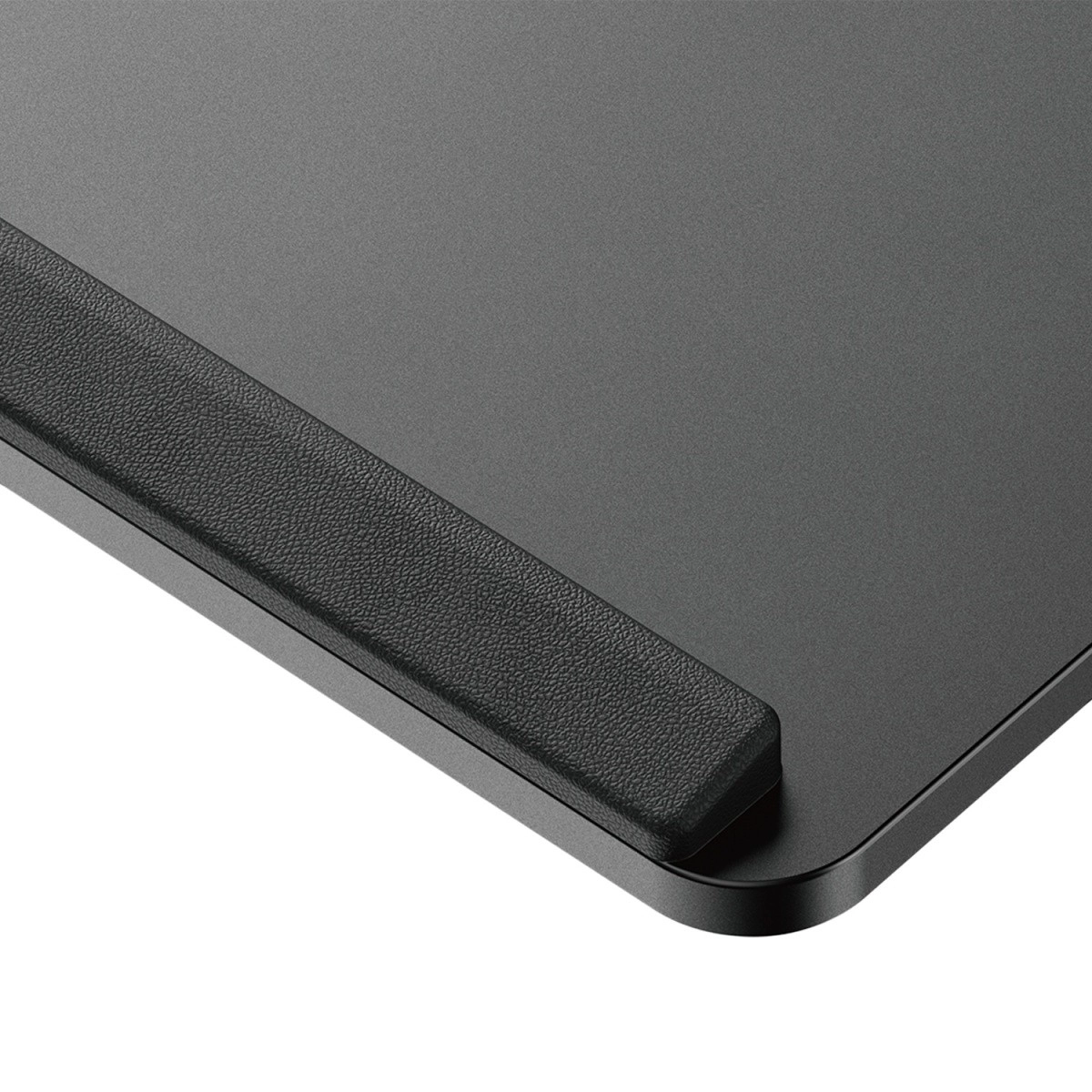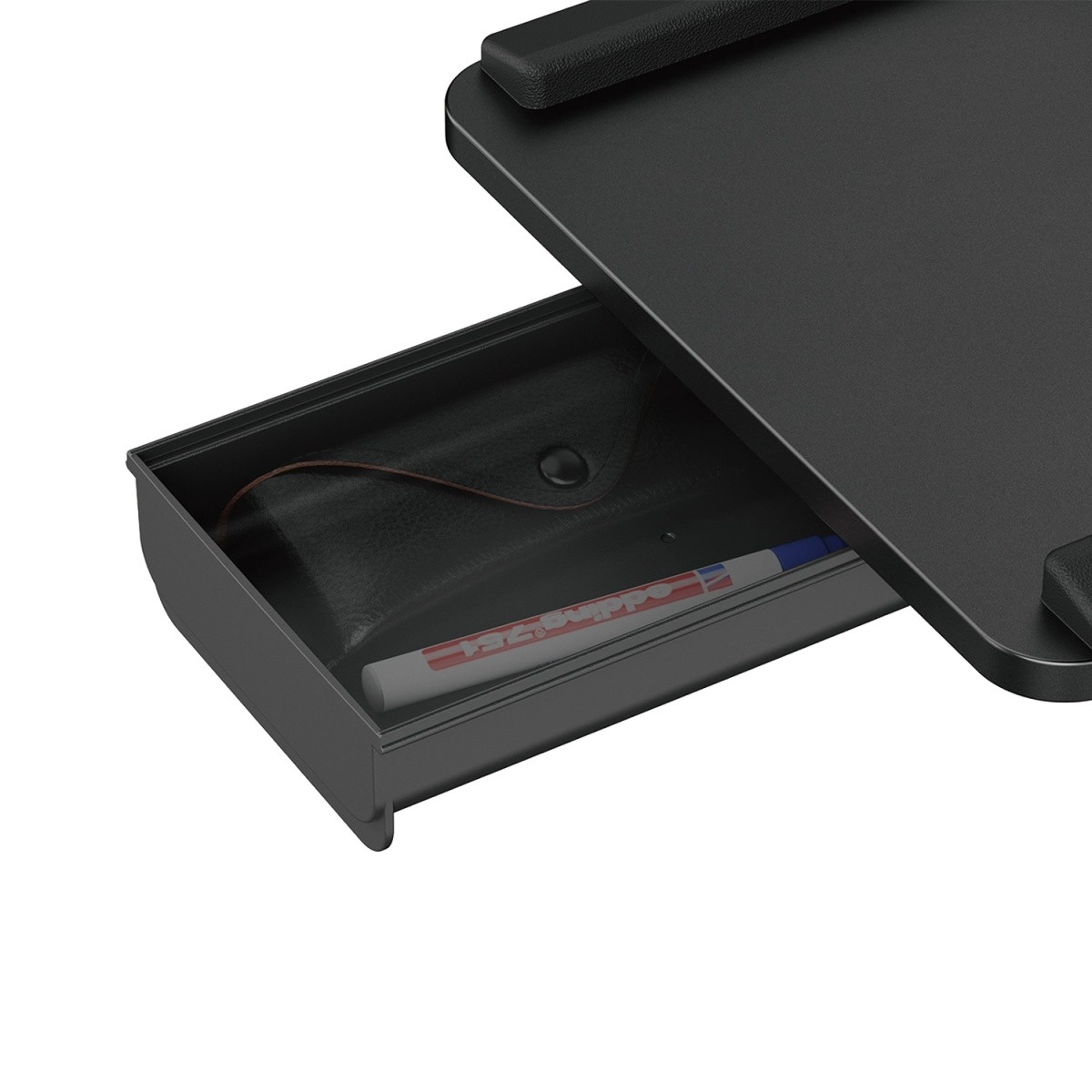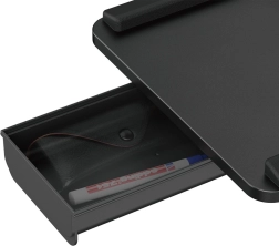 De geïntegreerde uittrekbare zijlade biedt plek voor kleine accessoires en de verhoogde randen rondom voorkomen dat toetsenbord of muis eraf glijden.