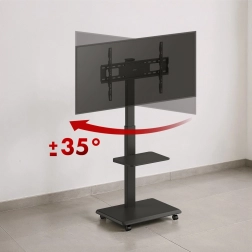 De brede basis met wielen en vergrendeling maakt soepel verplaatsen tussen ruimtes mogelijk en veilig vastzetten op de plek. De praktische plank biedt ruimte voor accessoires zoals spelers, set-top boxen of presentatiesystemen.