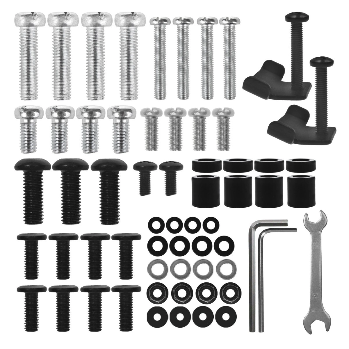 Inclusief een uitgebreide set schroeven, afstandsbusjes, inbussleutels en gereedschap – zo rond je de montage snel af zonder extra onderdelen te hoeven zoeken.