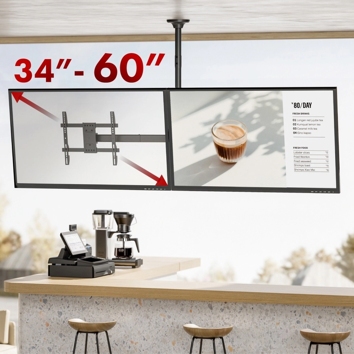 De lange dwarsbalk en het dubbele VESA-montagesysteem zorgen voor een veilige installatie van twee tv’s in één lijn. Ideaal voor menu boards, informatiesystemen en presentaties.