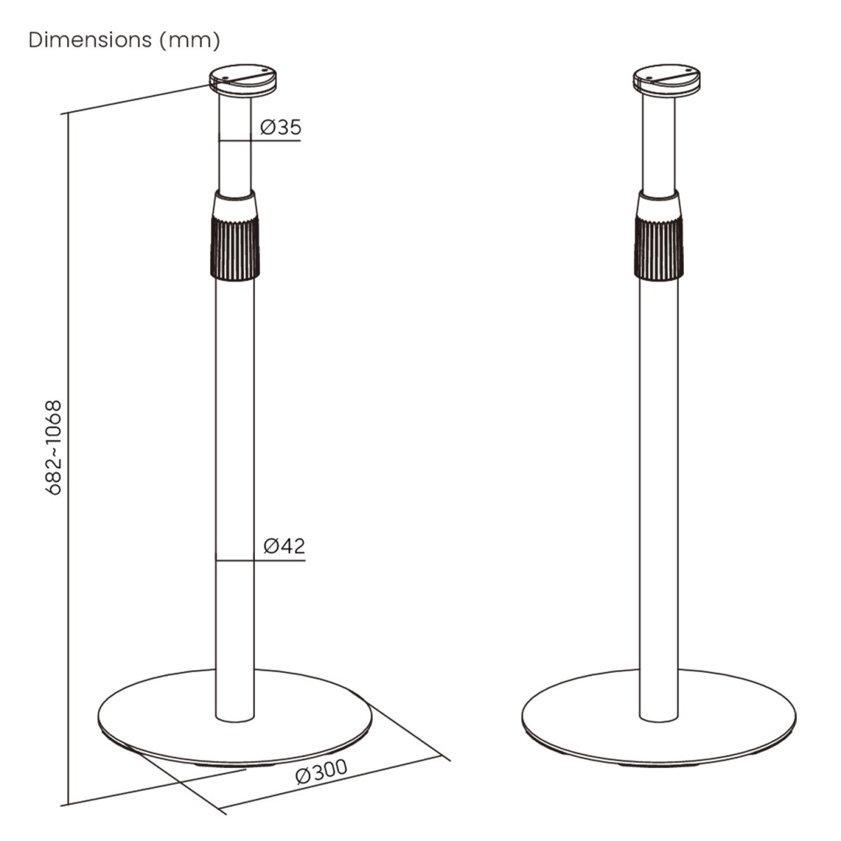 De vloerstatieven MC-496 zijn ontworpen voor de perfecte plaatsing van de SONOS ERA 100 en ERA 300 luidsprekers. Dankzij de telescopische hoogteverstelling stem je eenvoudig de optimale luisterhoogte en geluidsrichting af. De robuuste stalen basis en stevige kolom zorgen voor veilige stabiliteit zonder ongewenste trillingen.