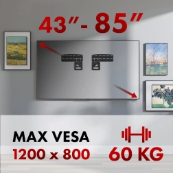 De robuuste metalen constructie met een draagvermogen van 60 kg garandeert langdurige stabiliteit, zelfs bij grote beeldformaten van 43–85". Het doordachte montagesysteem met precieze sjablonen en een schroevenset vergemakkelijkt de installatie en maakt veilige bevestiging op verschillende muursoorten mogelijk.