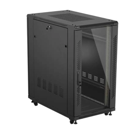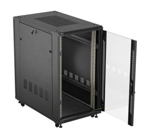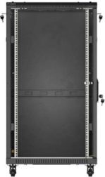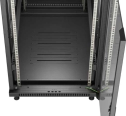 De afsluitbare glazen voordeur maakt controle binnenin de kast mogelijk zonder te openen en beschermt de apparatuur tegen ongeautoriseerde toegang.