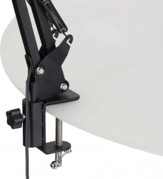 In de verpakking vindt u zowel een stabiele ronde voet als een klembevestiging voor de rand van het blad (max. 5 cm). Kies de oplossing die past bij uw werkplek – op het bureau of ruimtebesparend met de klem.