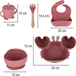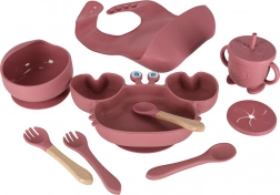 Deze 9-delige set in een elegante donkerroze tint bevat alles wat je nodig hebt voor comfortabel en veilig voeren vanaf 6 maanden. Het krab-vakbord en de kom met krachtige zuignappen blijven stevig op tafel of kinderstoel, waardoor morsen en rommel tot een minimum worden beperkt. Zachte food-grade siliconen zonder BPA is vriendelijk voor tandvlees en tandjes en is bovendien eenvoudig te reinigen.