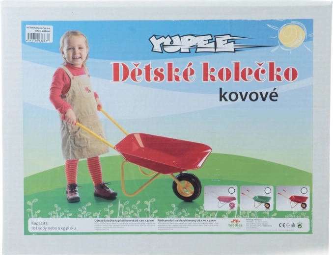 Duurzame Yupee kinderkruiwagen van stevig metaal voor veilig en leuk buitenspelen in de tuin en op de speelplaats. Voorzien van een robuuste metalen bak, kunststof handgrepen voor een comfortabele grip en afgeronde hoeken voor extra veiligheid. Geschikt voor kinderen vanaf 3 jaar.