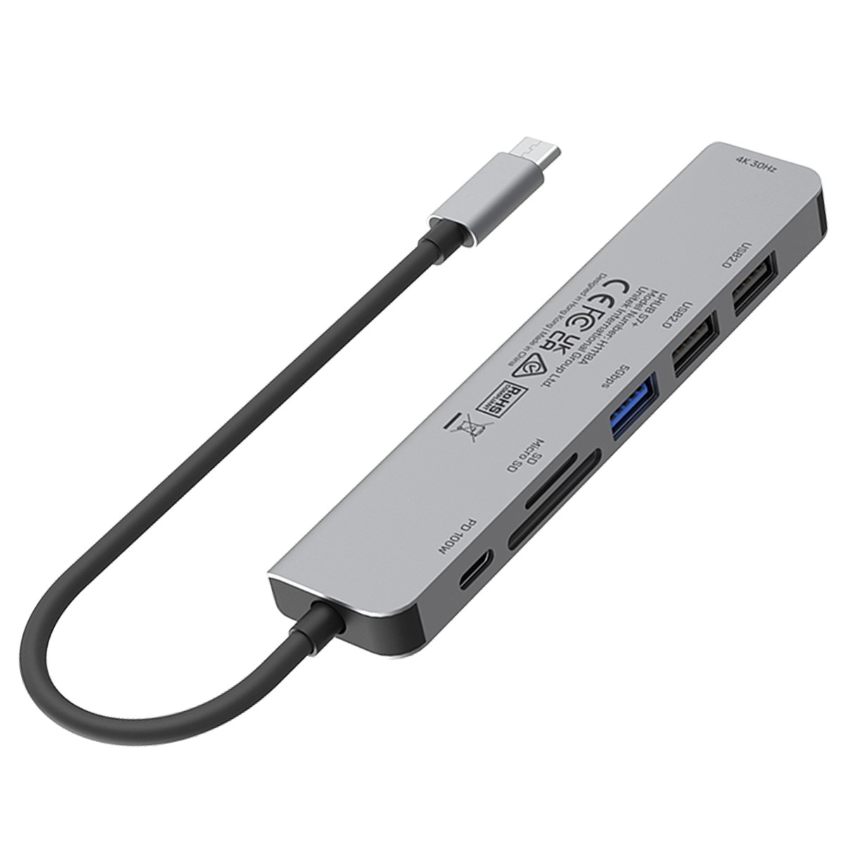 Compacte en krachtige 7‑in‑1 USB‑C‑hub voor moderne laptops en tablets. Biedt HDMI 4K (30 Hz), snelle USB‑poorten tot 5 Gbps, een SD/microSD‑kaartlezer en doorvoer Power Delivery 100 W. De elegante aluminium behuizing en de geïntegreerde kabel van 15 cm zorgen voor comfortabel en betrouwbaar gebruik thuis en onderweg.
