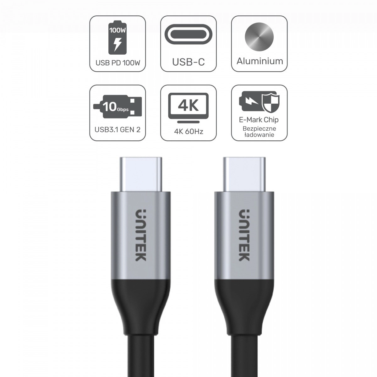 Dankzij de geïntegreerde E‑MARK‑chip kiest de kabel intelligent veilige laadparameters en garandeert hij een stabiele overdracht. Robuuste aluminium connectoren en hoogwaardige afwerking verlengen de levensduur van de kabel, zelfs bij frequent in- en uitpluggen. Een uitstekende oplossing voor werk, studie en reizen – van back‑ups tot het aansluiten op een extern beeldscherm.