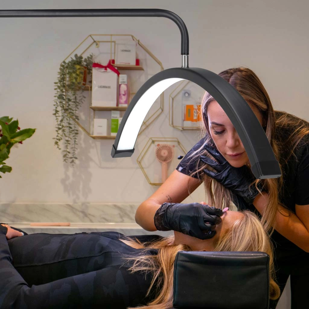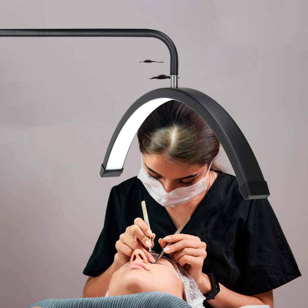 De gebogen LED-kop (64 cm) verlicht het werkvlak gelijkmatig zonder harde schaduwen – ideaal voor precisiewerk aan wimpers, wenkbrauwen en nagels.