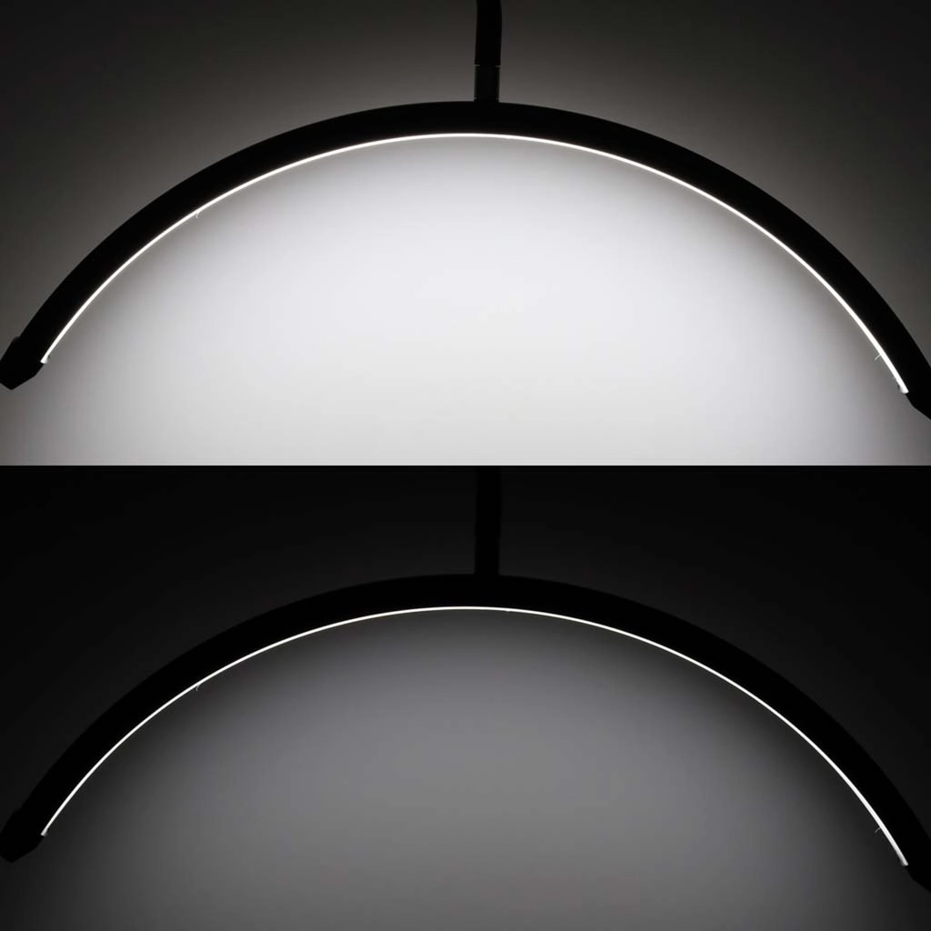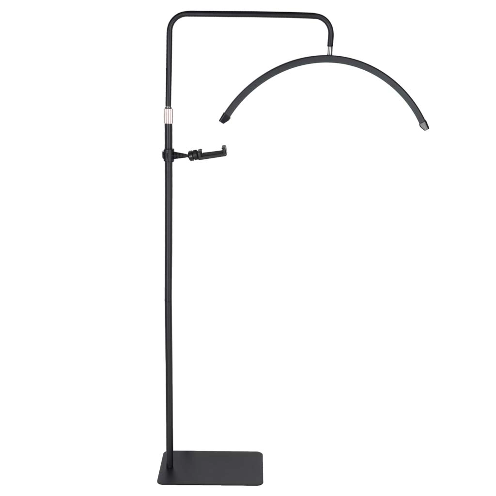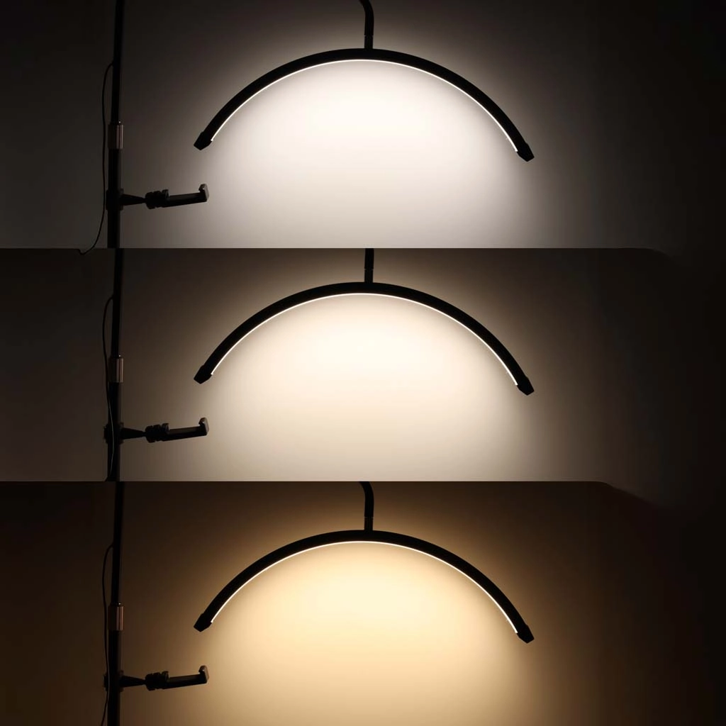 Professionele LED gebogen lamp voor cosmetica met een vermogen van 36 W biedt egale, schaduwvrije verlichting voor lash & brow styling, manicure, make-up en fotografie. Beschikt over een breid bereik van kleurtemperatuur 3000–5600 K, 10 helderheidsniveaus en een hoge kleurechtheid RA>90 voor natuurgetrouwe details. De stabiele metalen standaard met verstelbare hoogte en telefoonhouder vergemakkelijkt het werken en het maken van content voor sociale media.