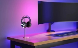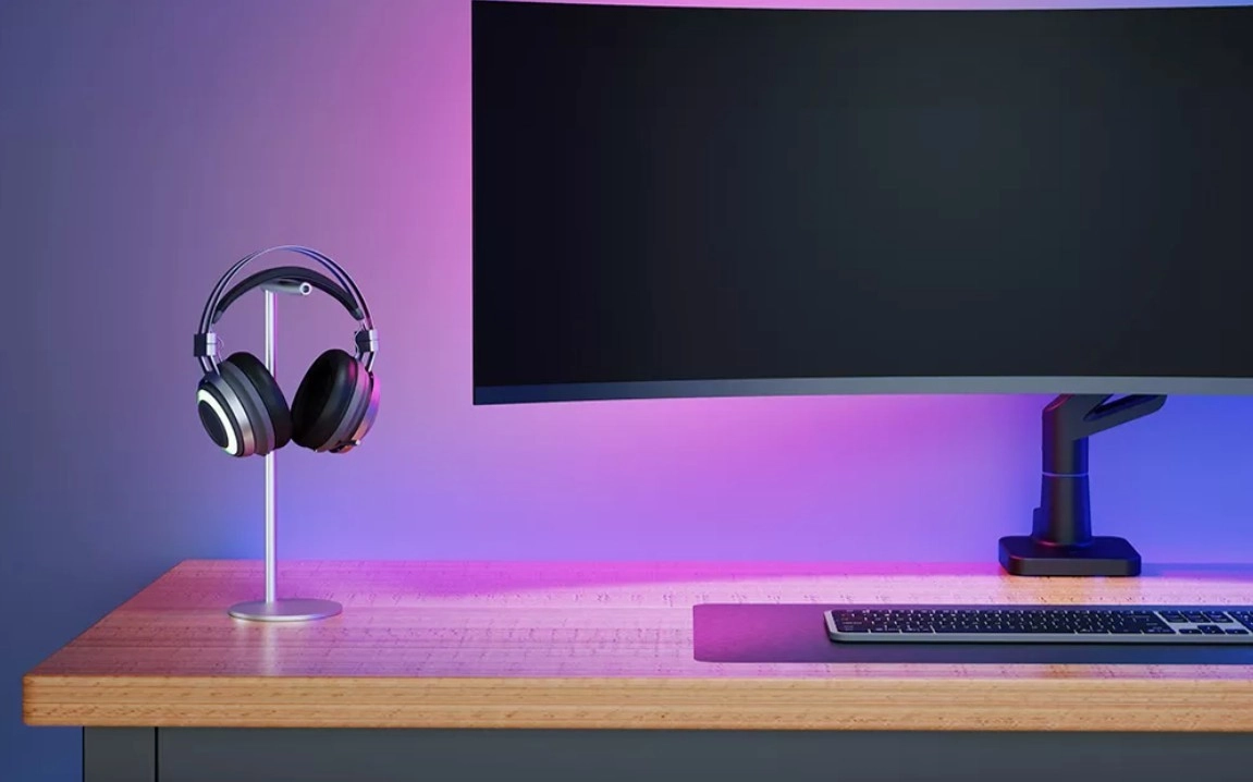 De slanke kolom en korte arm houden de koptelefoon overzichtelijk boven het blad, zodat je meer vrije ruimte hebt om te werken en te gamen.