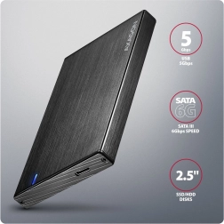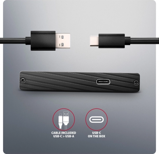 De elegante aluminium externe box beschermt je schijf en zorgt tegelijkertijd voor efficiënte warmteafvoer. De omkeerbare USB‑C‑connector en de meegeleverde USB‑C → USB‑A‑kabel vereenvoudigen de aansluiting op de computer. Dankzij SATA 6G en UASP benut je de snelheid van moderne SSD’s volledig.