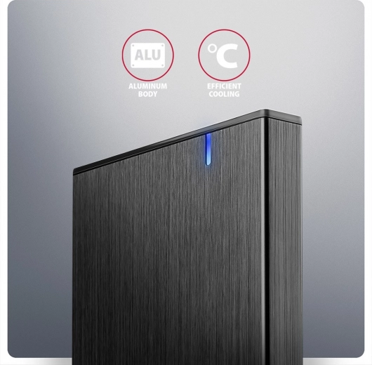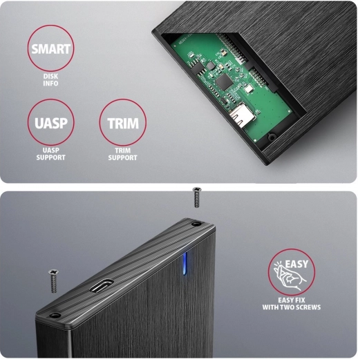 De behuizing ondersteunt TRIM voor een langdurige conditie van SSD’s, het uitlezen van S.M.A.R.T.-gegevens, automatische slaapstand van de schijf en probleemloze Plug & Play-aansluiting inclusief Hot Plug. Het geborstelde oppervlak oogt strak en vermindert zichtbare vingerafdrukken.