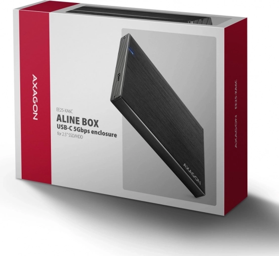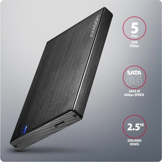 Compacte en duurzame aluminium externe behuizing van AXAGON voor 2,5" SSD/HDD met USB‑C 3.2 Gen 1 tot 5 Gbps, ondersteuning voor UASP voor hogere SSD‑prestaties, TRIM, S.M.A.R.T. en betrouwbare koeling dankzij de aluminium behuizing met een geborsteld oppervlak.