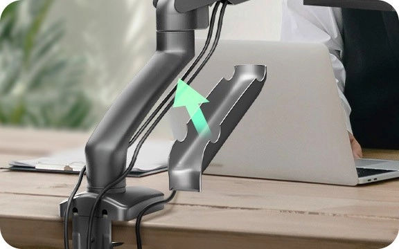 De praktische geïntegreerde kabelgeleiding verbergt de bekabeling onder de arm, wat rommel en struikelgevaar vermindert. De houder biedt een dubbele montagemogelijkheid – klem op de rand van het bureau of doorvoermontage – voor een veilige en veelzijdige bevestiging op de meeste bladen. Compatibiliteit met VESA 75×75 en 100×100 garandeert een snelle installatie van de meeste gangbare monitors.