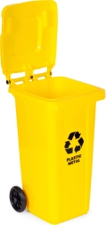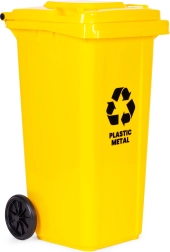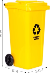 Duurzame gele vuilnisbak met een inhoud van 120 l voor het scheiden van plastic en metaal. Gemaakt van UV-bestendig HDPE, met rubberen wielen, ergonomische handgrepen, stabilisatiepootjes en een sluitend deksel. Compatibel met gemeentelijke systemen EN 840, ideaal voor huishoudens en bedrijven.