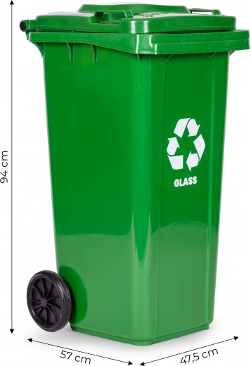 Complete set van vijf containers met een inhoud van 5×120 l voor overzichtelijke afvalscheiding: papier, glas, plastic/metaal, restafval, bio. Duurzame behuizing van HDPE, rubberen wielen op een metalen as, ergonomische handgrepen en stabiliserende antislipvoeten. De deksels zijn nauwsluitend, de containers voldoen aan EN 840 en de normen ISO9001/14001/45001 – ideaal voor huishoudens, bedrijven en faciliteiten.