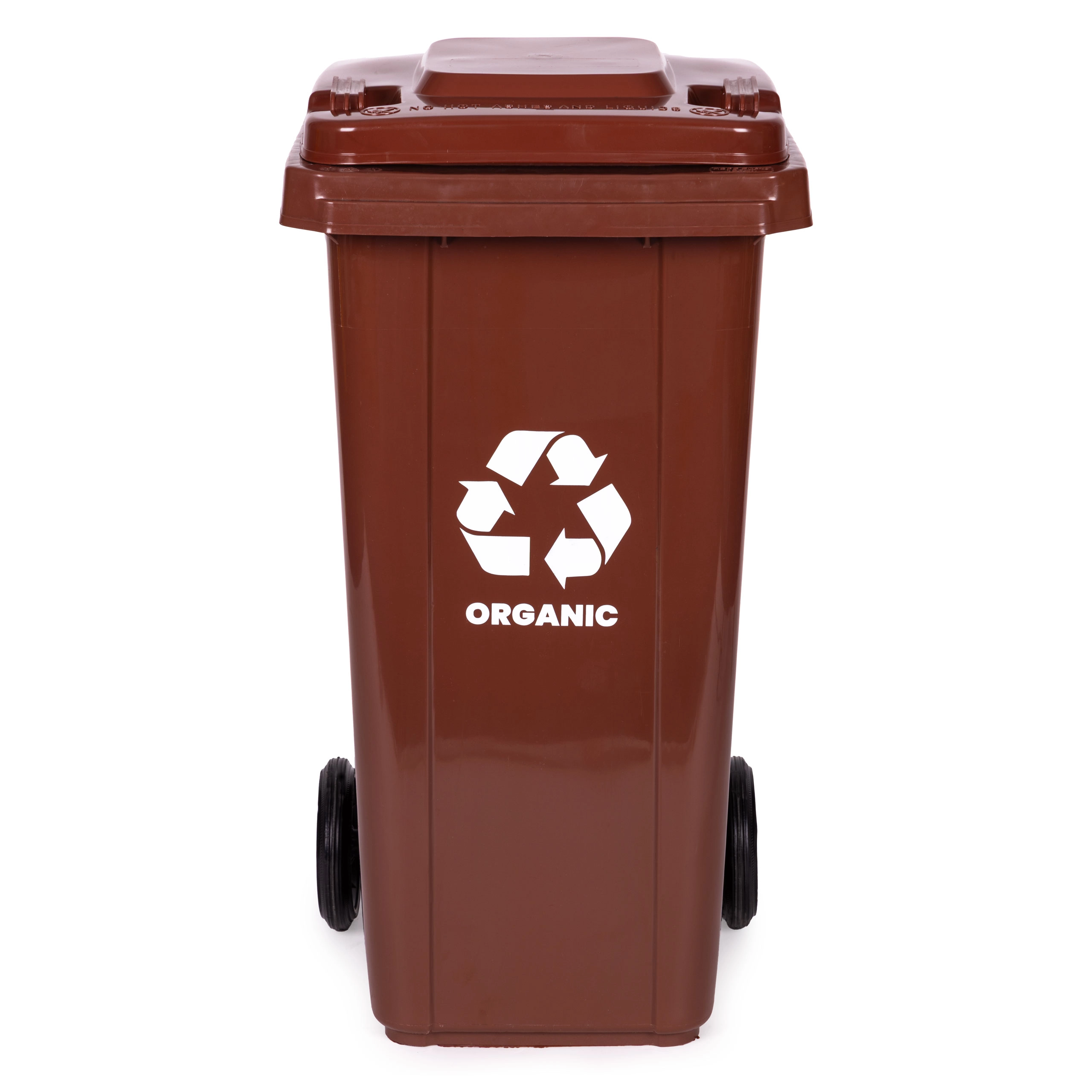Kleuren en labels voor papier, glas, plastic/metaal, restafval en bioafval vereenvoudigen correct scheiden thuis en op het werk. Elke container heeft 120 l en een afsluitbaar deksel.
