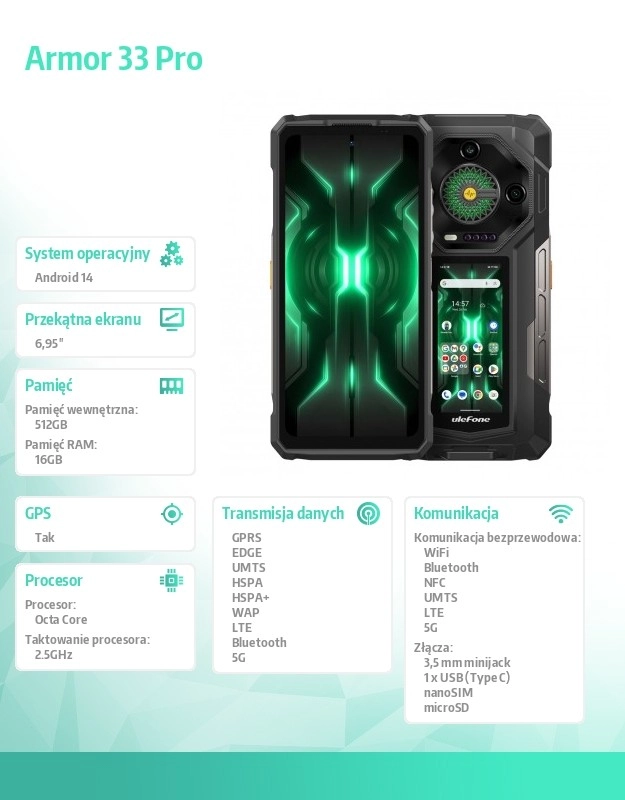 Zoek je een telefoon die zware arbeid, veeleisende omgevingen en langdurig gebruik aankan? De Ulefone Armor 33 Pro 5G combineert een robuuste constructie met moderne prestaties. De octa‑core MediaTek Dimensity 7300X en 16 GB RAM zorgen voor vloeiende games, apps en multitasking, terwijl je het 512 GB opslag eenvoudig uitbreidt met een microSD‑kaart tot 2 TB.