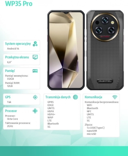 OUKITEL WP35 Pro 5G is een robuuste smartphone voor veeleisende omstandigheden met extreme uithoudingsvermogen en snel 5G. Hij biedt een octa‑core MediaTek Dimensity 6300, 12 GB RAM (tot 36 GB met virtueel geheugen), 512 GB opslag uitbreidbaar tot 2 TB, een 6,6" FHD+ display met Gorilla Glass 5 en een 64MP SONY‑camera met nachtzicht. Voldoet aan IP68/IP69K en MIL‑STD‑810H en dankzij de 11.000 mAh‑batterij met 33W snelladen gaat hij echt lang mee.