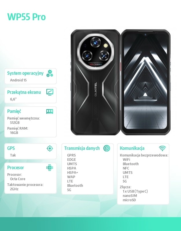 OUKITEL WP55 Pro is een robuuste 5G‑smartphone voor veeleisende omstandigheden met certificeringen IP68 / IP69K / MIL-STD-810H, een grote batterij van 11.000 mAh, een vloeiend 120Hz display en een combinatie van 16 GB RAM + 512 GB opslag. Hij biedt een krachtige MediaTek Dimensity 7025 chip, een 108 MP camera en functies als NFC, 5G, Bluetooth 5.2 en Wi‑Fi 2,4/5 GHz.