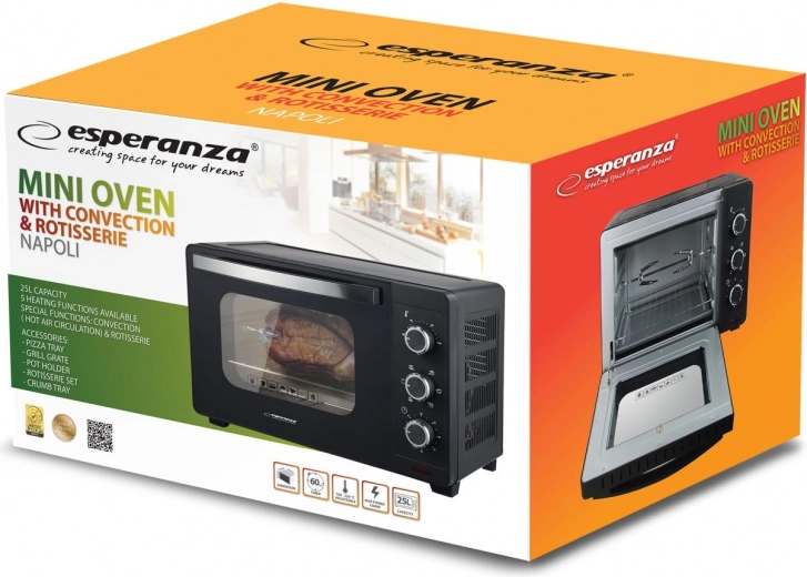 Compacte mini-oven ESPERANZA Napoli met een inhoud van 25 l, convectie en draaispit. Biedt 5 bakmodi, vermogen 1600 W, temperatuur 100–230 °C en timer 0–60 min. Dankzij het dubbele glazen deurpaneel en efficiënte isolatie bespaart hij energie, warmt sneller op en houdt een stabiele temperatuur aan voor gelijkmatig bakken van pizza, vlees en groenten.