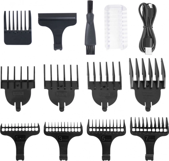 In de doos vind je 8 opzetkammen (T‑type: 1/3/5/7 mm; klassiek: 3/6/9/12 mm) en een body‑opzetstuk met 4‑traps lengteregeling. De metalen behuizing met gegraveerde decoratie ligt uitstekend in de hand, USB‑C‑laden is snel en praktisch. Op één lading werkt het ongeveer 90 minuten, volledig opladen duurt circa 2 uur.