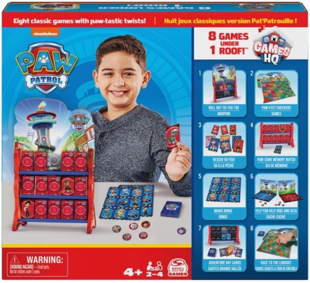 Geniet van familieplezier met een set van acht klassieke spellen in de unieke 3D-stijl van het hoofdkwartier van PAW PATROL. Je vindt hier bingo, boter-kaas-en-eieren, dammen en andere eenvoudige spellen voor 2–4 spelers vanaf 4 jaar, die logica, concentratie en teamwork ontwikkelen.