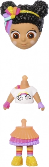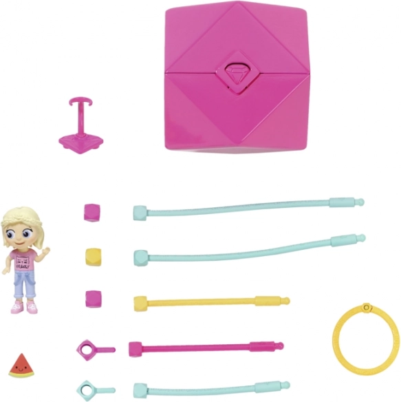 - Pop in drie delen (hoofd, romp, benen), hanger, 2× connector, 3× scheider, 1× ring, 5× gekleurd verbindingskoord, 1× popstandaard, “diamanten” verpakking