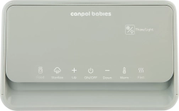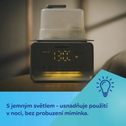 De ingebouwde thermostaat houdt de gekozen temperatuur tot 10 uur vast. Subtiele verlichting maakt nachtelijk gebruik makkelijker zonder de baby te wekken.