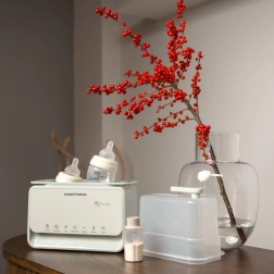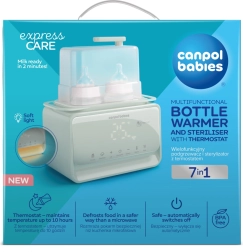 De elektrische flessenwarmer en sterilisator Canpol babies 7-in-1 brengt moedermelk en babyvoeding binnen enkele minuten betrouwbaar op de ideale temperatuur. De ingebouwde thermostaat behoudt de gekozen temperatuur tot 10 uur, zelfs bij gelijktijdig opwarmen van twee flessen. Het apparaat desinfecteert flessen, spenen en onderdelen van kolven in 10 minuten, zodat alles hygiënisch en zorgeloos klaar is.