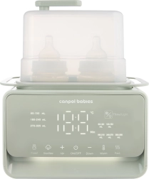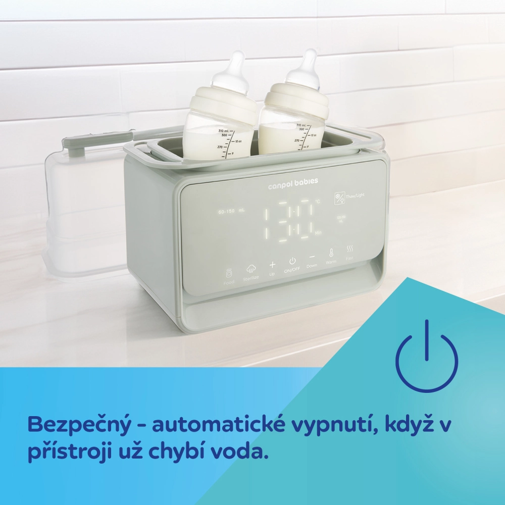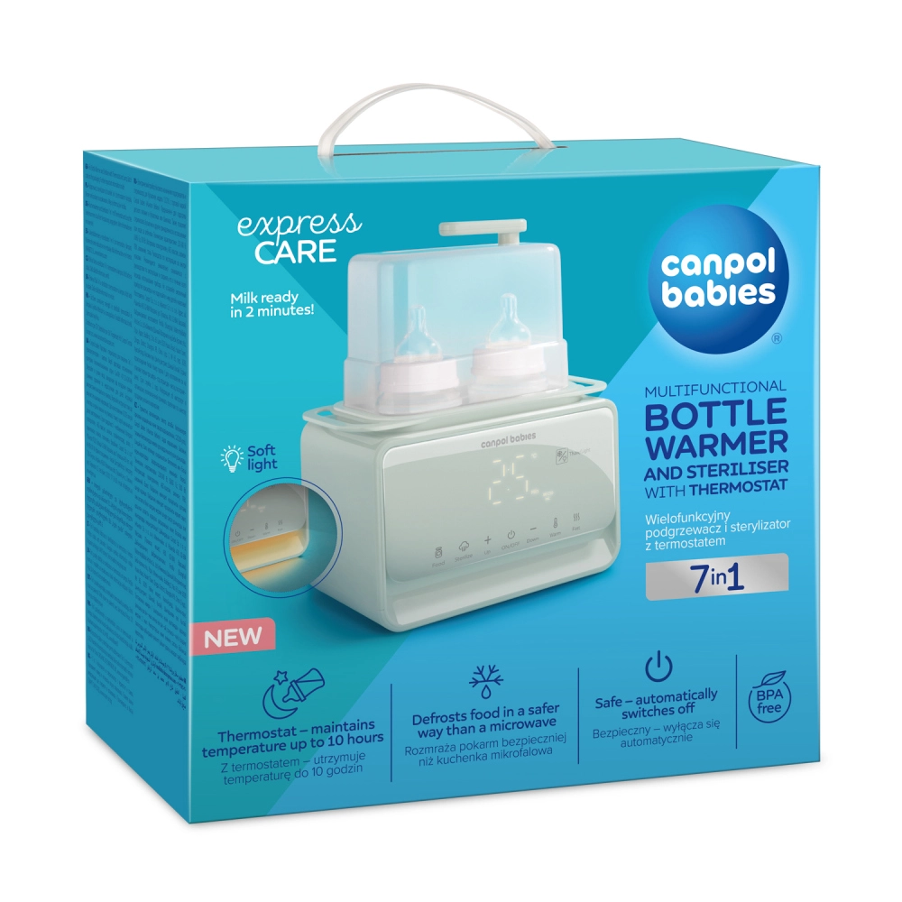 De multifunctionele Canpol babies 7-in-1 is een slimme helper voor snel voeden en zorg voor babyaccessoires. Biedt het opwarmen van melk, het opwarmen van hapjes, snelle opwarming in 2–3 minuten, ontdooien, sterilisatie, temperatuur behouden tot 10 uur en subtiel nachtlicht. Dankzij de thermostaat en intuïtieve touchbediening is het gebruik veilig, comfortabel en tijdbesparend.