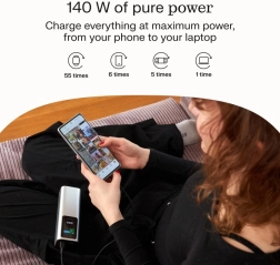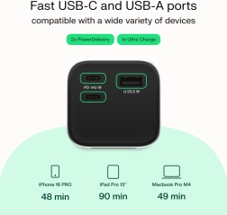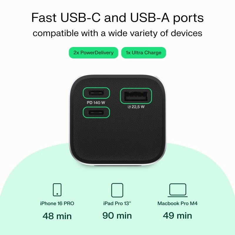 Uitgangsvermogen tot 140 W met Power Delivery kan compatibele ultrabooks en veeleisendere apparaten snel opladen, desnoods ook gelijktijdig.