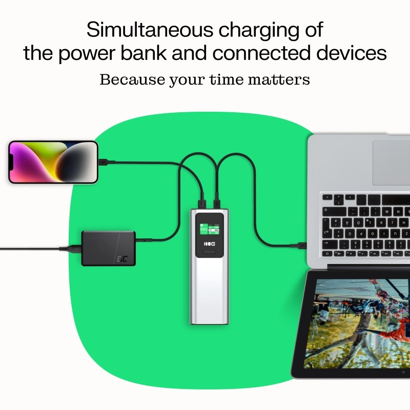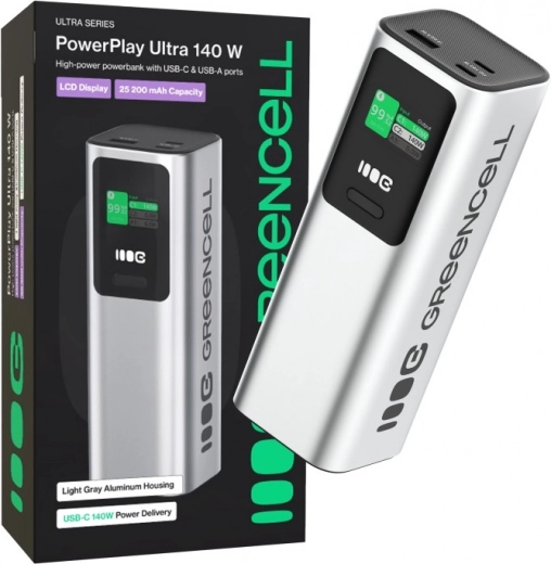 Zoek je een vervanging voor het stopcontact onderweg? De GREEN CELL PowerPlay Ultra powerbank combineert een enorme capaciteit van 25200 mAh en ultrasnel laden met 140 W PD, zodat je zelfs twee laptops tegelijk kunt voeden en je smartphone of tablet meerdere keren kunt opladen. Dankzij USB‑C en USB‑A poorten is hij compatibel met een brede reeks apparaten en klaar voor moderne laadstandaarden.