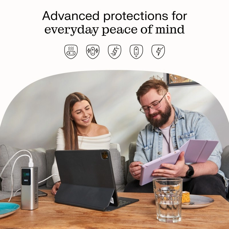Het geïntegreerde LCD‑display geeft in real time essentiële gegevens: laadstatus, actueel vermogen, aantal cycli, temperatuur en werkelijke capaciteit. De pass‑through functie maakt gelijktijdig laden van de powerbank en apparaten mogelijk – bespaart tijd en verhoogt het comfort. De powerbank voldoet aan internationale luchtvaartnormen, dus je kunt hem meenemen in het vliegtuig.