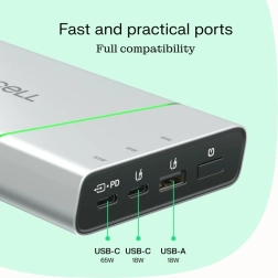 - Vermogen 65 W (USB‑C PD) – snel opladen van laptops en telefoons.