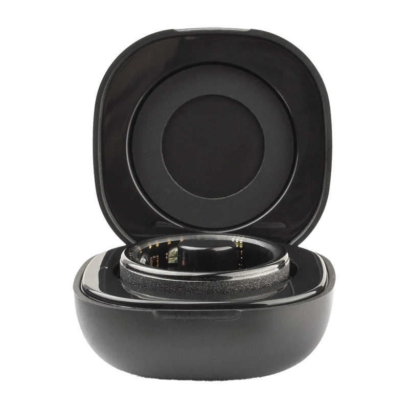 Het praktische etui verlengt de gebruiksduur tot weken. De ring zelf gaat 3–5 dagen mee; opladen in het etui is snel en betrouwbaar.