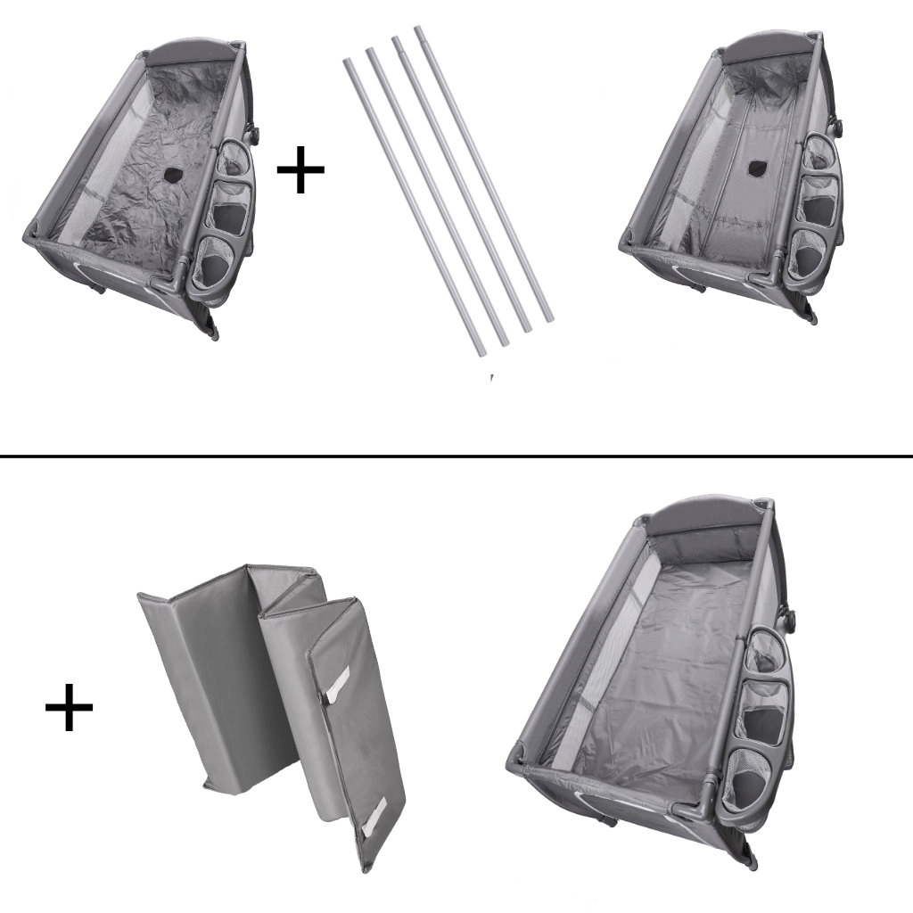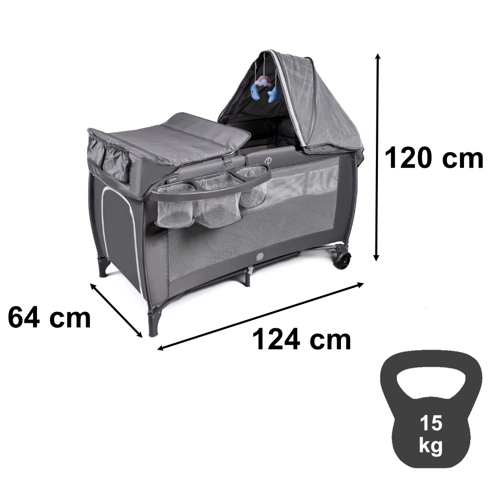 Voor ouders is er een aankleedblad en praktische organizers voor luiers en spulletjes, zodat je alles altijd bij de hand hebt. Het snelle vouwmechanisme, wielen met vergrendeling en de draagtas maken verplaatsen en opbergen eenvoudig – ideaal voor op vakantie, bij grootouders en in kleine appartementen.