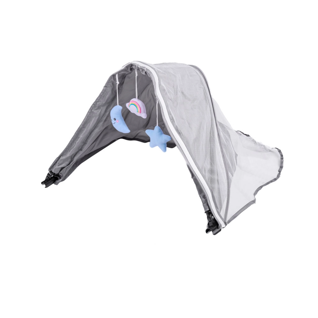 Lichte mesh beschermt tegen insecten en ventileert tegelijk. De hangende pluchen speeltjes (maan, regenboog, ster) stimuleren de zintuigen en vermaken je baby.