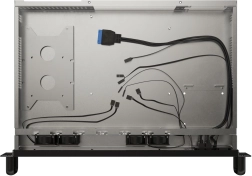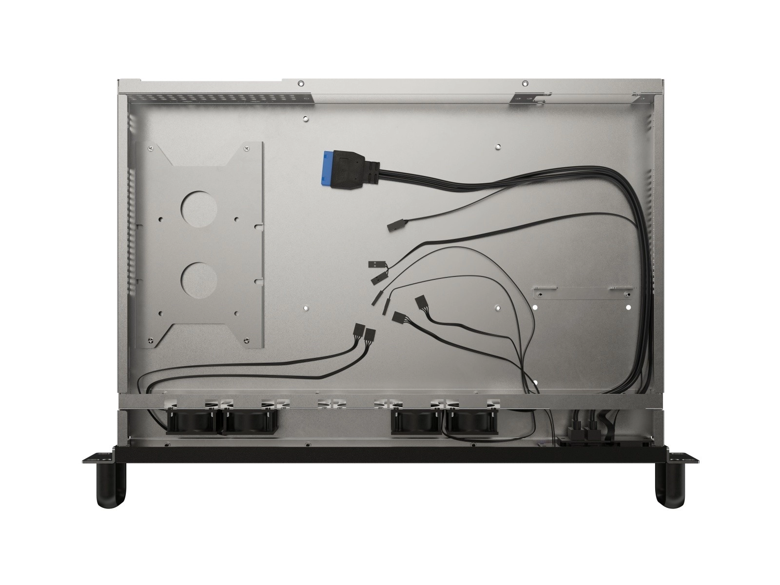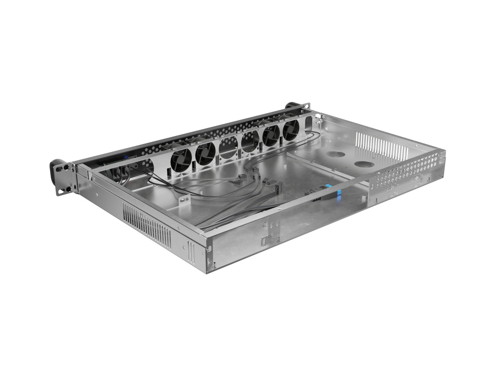 De koeling wordt verzorgd door 4× 40 mm PWM‑ventilatoren (ca. 4000–8000 rpm) die lage geluidsproductie met een lange levensduur combineren, zodat het systeem stabiel blijft, ook bij continu bedrijf. De behuizing is gemaakt van 1,0 mm gegalvaniseerd staal voor meer weerstand tegen vibraties en mechanische belasting, wat de componenten beschermt tijdens rackmontage en transport.