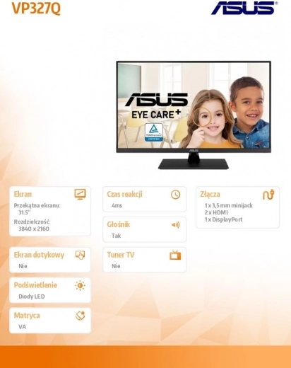 Geniet van haarscherp beeld in 4K UHD-resolutie op het ruime 31,5" scherm met Eye Care-technologie voor comfortabel kijken zonder vermoeidheid. De monitor biedt moderne aansluitingen HDMI en DisplayPort, nauwkeurige kleuren en vloeiende weergave voor werk, entertainment en multimedia.