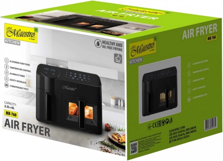 De Maestro heteluchtfriteuse biedt een moderne manier van koken zonder toegevoegde vetten. Twee aparte manden met een inhoud van 3,5 l en 6 l maken het mogelijk om verschillende gerechten tegelijk te bereiden – ideaal voor gezinnen en veeleisendere gebruikers. Het krachtige vermogen van 2400 W zorgt voor snel opwarmen en een gelijkmatige circulatie van hete lucht voor knapperige resultaten.
