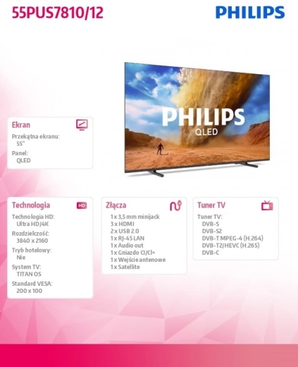 Deze 55" LED-televisie van PHILIPS brengt een groots beeld naar je woonkamer met nadruk op kwaliteit, contrast en vloeiendheid. Ideaal voor home cinema, sportuitzendingen en streaming, met natuurlijke kleuren en een gebruiksvriendelijke interface.