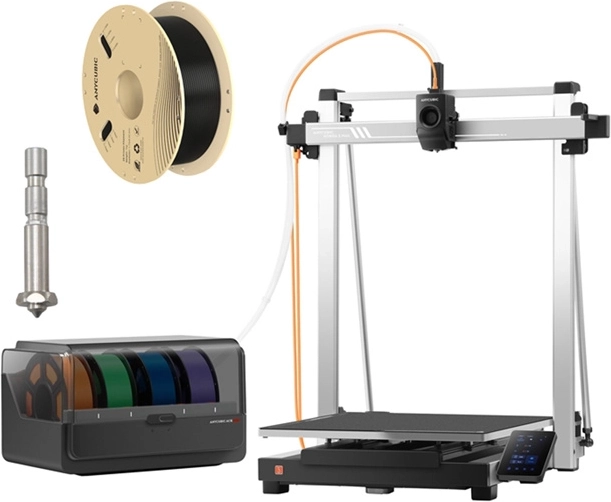 Voor gemak en efficiency zijn er Anycubic Slicer Next, bediening via Wi‑Fi/LAN en AI-functies zoals spaghetti-detectie en object overslaan (met camera). De Combo-versie voegt rijkelijke accessoires toe, waaronder een nozzle en 1 kg zwart PLA voor een directe start.