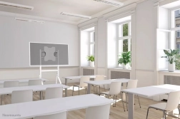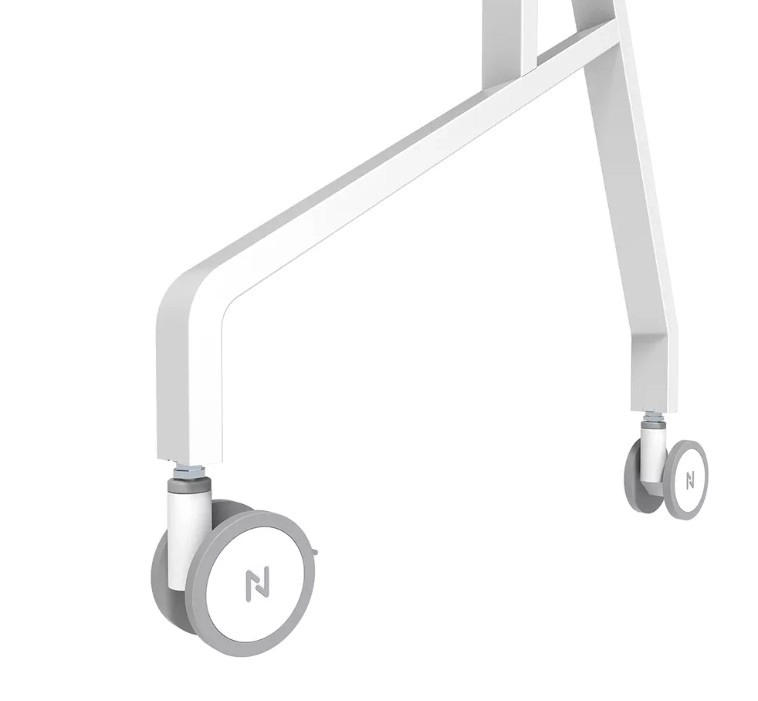Vier robuuste 100 mm wielen met rem en geïntegreerde handgrepen zorgen voor veilig en comfortabel verplaatsen tussen klaslokalen of vergaderruimtes.
